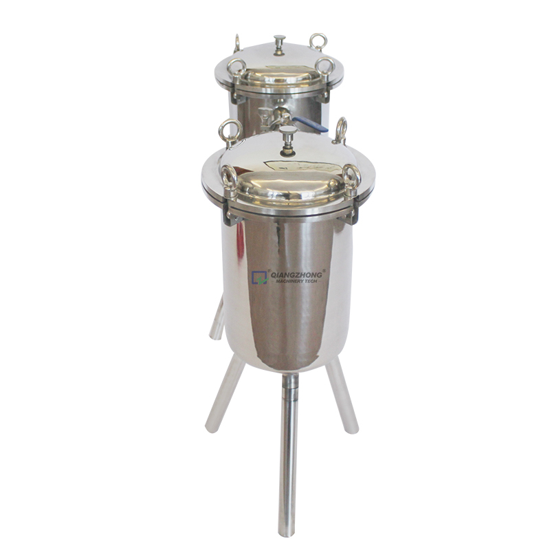 本滤器由两个圆柱型筒体与连接管路组成,内外表面抛光处理,滤筒内装有不锈钢滤网和滤网支撑篮;顶部装有放气阀,供过滤时排放滤器内空气作用。上盖与滤筒连接采用快开式结构,更方便于清洗(更换)滤网,三只可调节式支脚可使滤器平稳放置在地面上。连接管路采用活接或卡箍连接方式,进出料阀门采用卫生蝶阀启闭,耐压耐温,操作灵活方便,无料液泄漏更卫生。